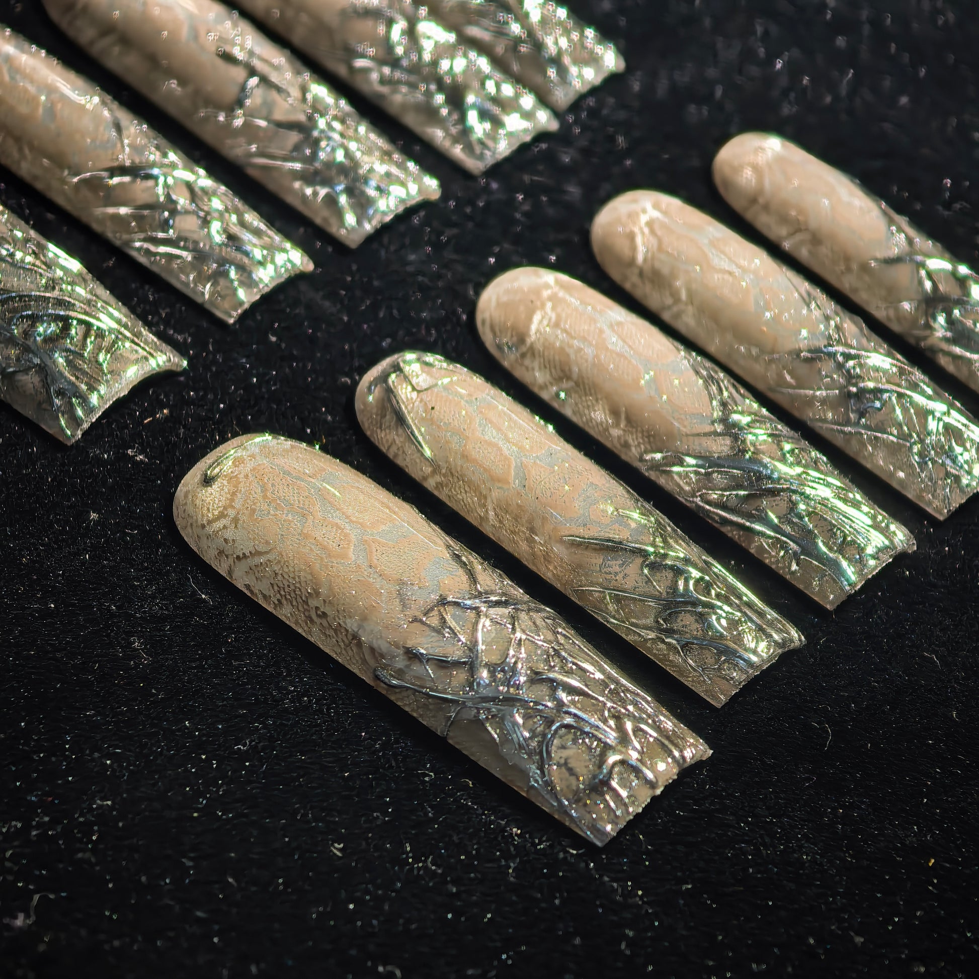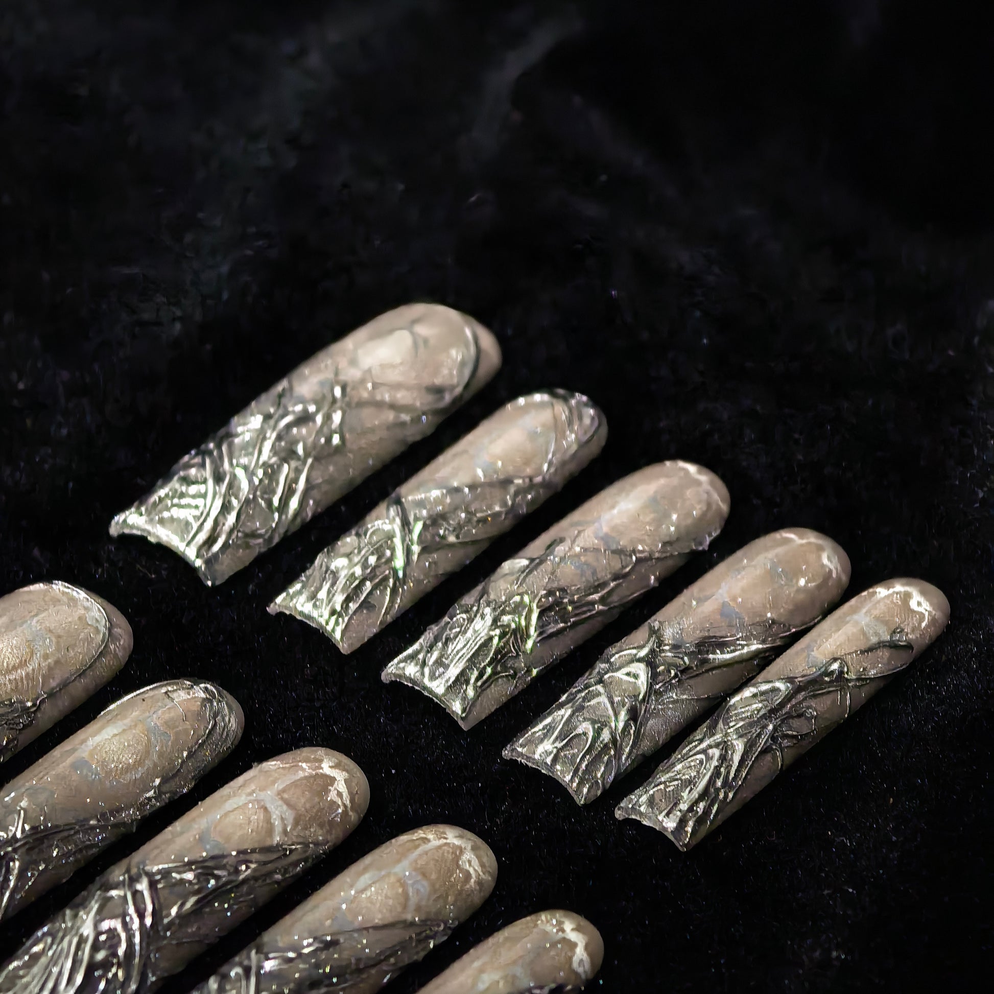 đš Striking Gothic Aesthetic: The stiletto shape elongates fingers for a sleek, glamorous look. Each nail blends a neutral nude base with a unique cracked glass textureand intricate metallic silver/green detailsâperfect for fans of gothic fashion, witchy vibes, or statement-making style.