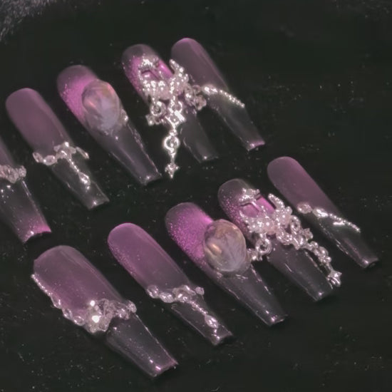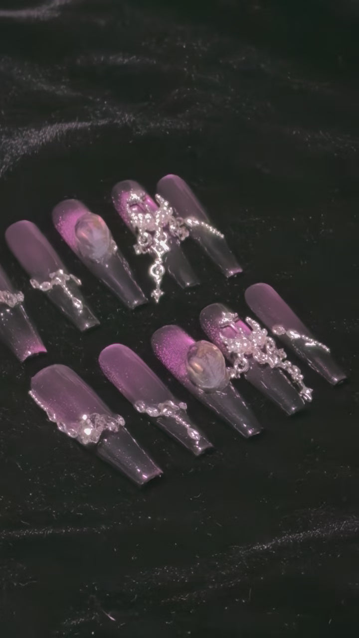 Crafted with a deep violet - to - black cat eye gradient base, these nails mimic the mystique of a galaxy under low light. Adorned with 3D diamante clusters, pearl accents, and delicate chain tassels, theyâre not just nail stickersâtheyâre wearable jewelry for your fingertips. Perfect for brides seeking âsomething blueâ (or sparkly!), evening gown companions, or anyone who wants to turn heads at a gala.