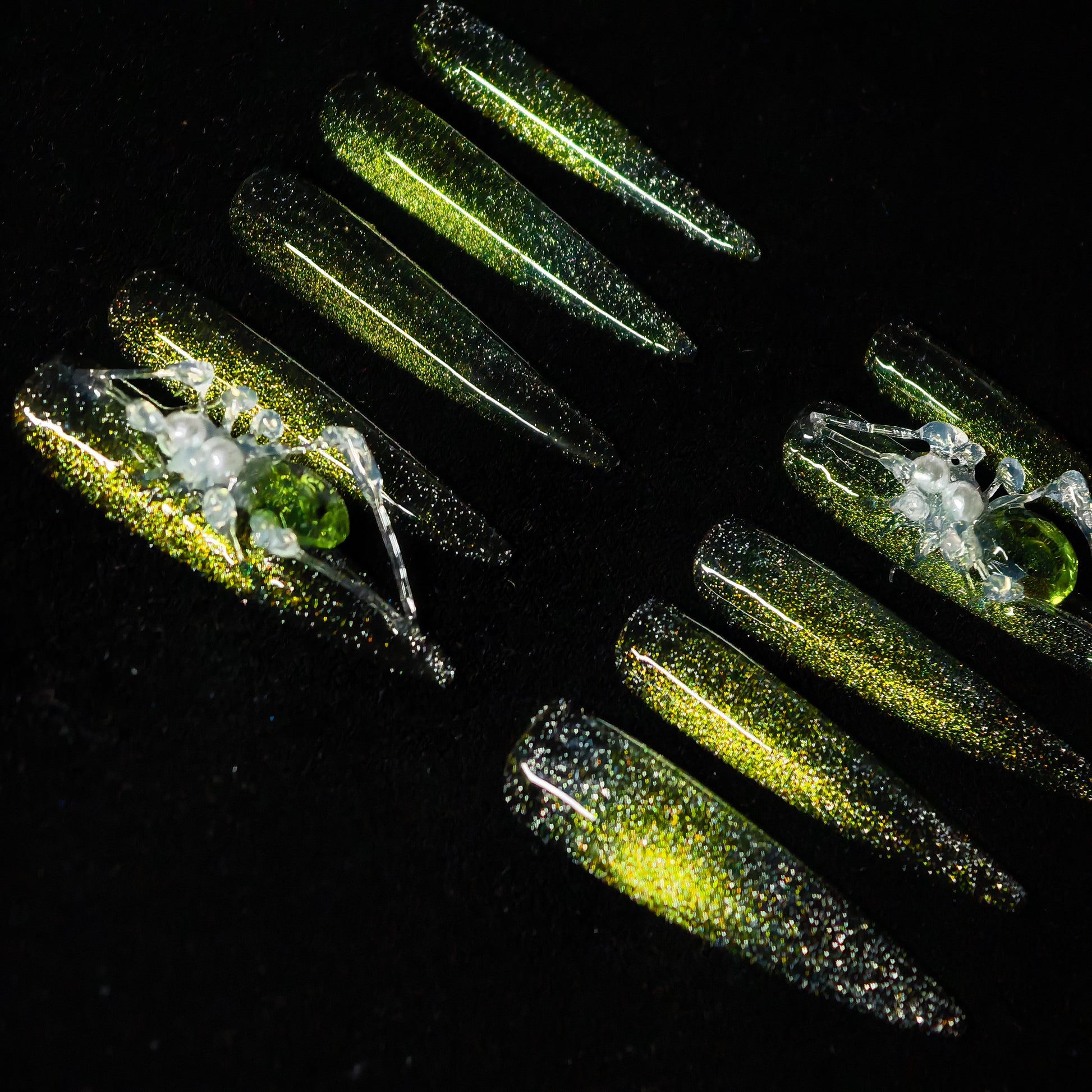 The deep emerald green glitterradiates a bewitching glow, while the 3D spider embellishment (with translucent “legs” and a faceted green stone) adds a darkly elegant focal point—ideal for gothic, witchy, or alternative fashion lovers.